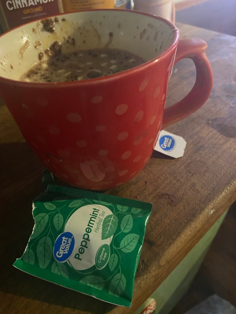 Splashes of redNew recipe we made up! Peppermint tea, a little hot water, then two scoops favorite hot cocoa mix, favorite milk, then more hot water, mix! Delicious peppermint cocoa.Rich reds…red reminds me of grace! ♥️🎄