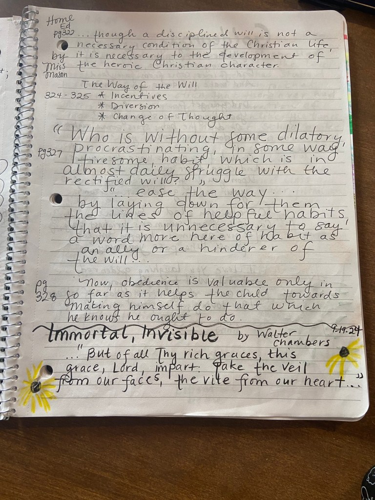 •I want to tie on my Apron of home keeping and hospitality in a new, fresh way this year. Sometimes this means making a meal for a new mom or dropping off a bouquet of sunflowers you grew. It can mean more than hosting in your home. I have an older house with one small bathroom. How can I use it to bless my hubby, children, and those around me? This isn’t an easy area for me, so I want to grow. I’d like to put some effort in helping my husband fix a few things and focus on a small, container flower garden on my older deck, as a way of extending our home this summer. I’d like to host bonfires in fine weather, as we have a lot of outdoor space. Praying for the Lord’s leading. I’m setting up my little to-do planner/memory book in anticipation! I feel like I’m being asked to focus on ‘Taking Heed/Paying Attention” as my phrase for the year. I found a quote by Charlotte Mason, my educational philosophy heroine, that uses the phrase “expectant attention” and it hit me like a lightening bolt. I want to pay attention to the Lord’s still small voice in expectancy for all the glorious Truth and Love He has for me.